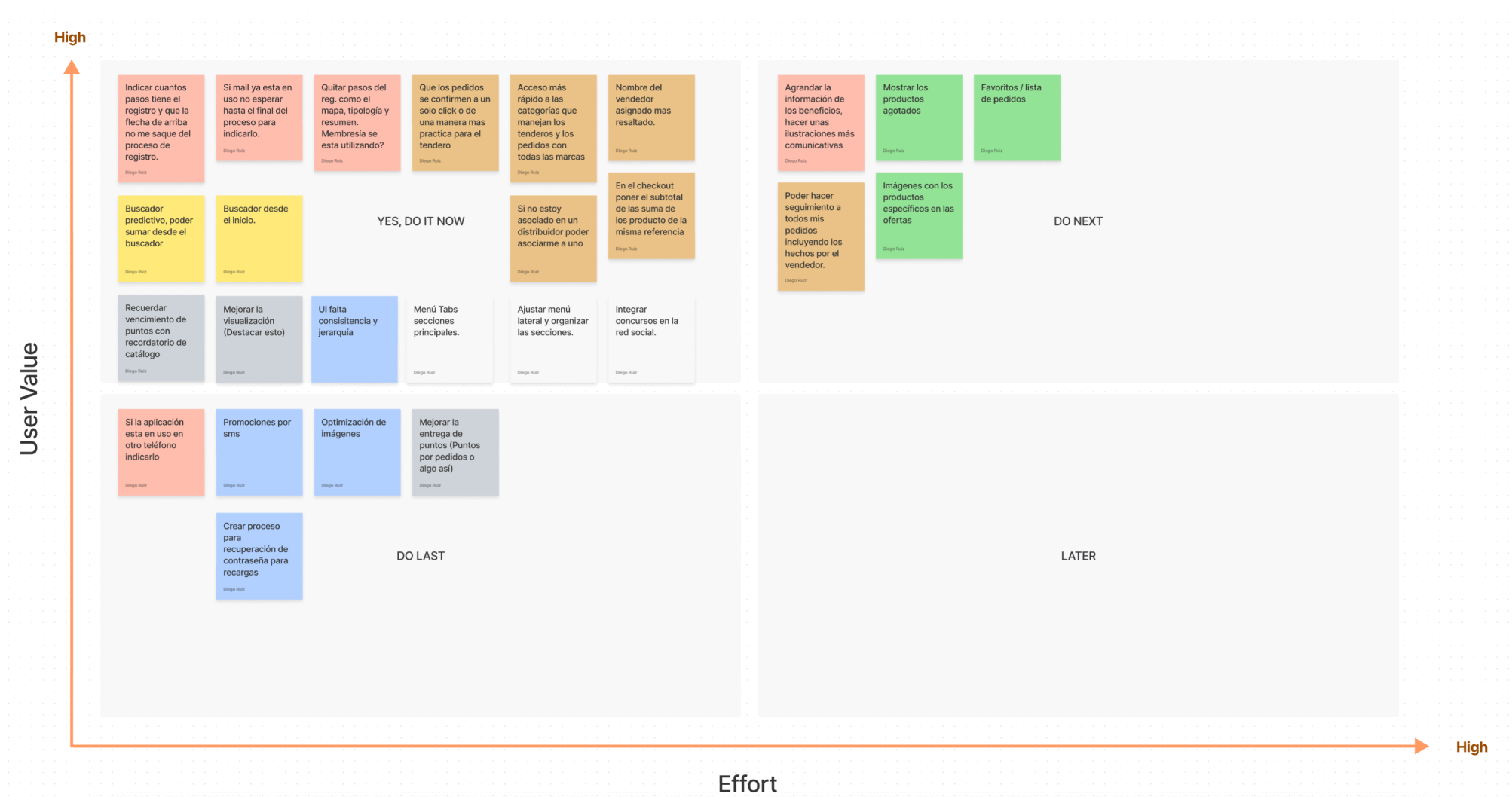 Una vez realizado el Diagrama de Afinidad, ordenamos las ideas en el diagrama de Priorización de Ideas. Las ideas se clasificaron según el esfuerzo y el valor para el usuario.