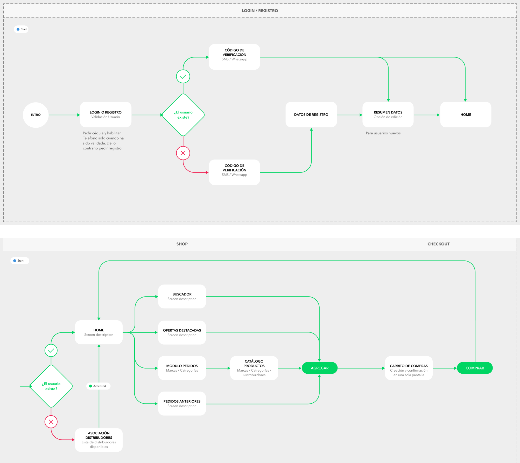 El primer paso en la etapa de creación de prototipos es crear flujos de usuario. Se crearon los flujos para las funciones principales, que son Registro/Login y Compra.